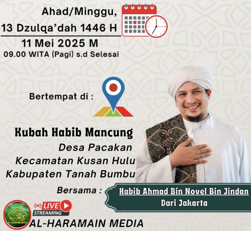 FokusInformasi.com, Tanah Bumbu – Peringatan haul ke-57 Al ‘Arif Billah Tuan Surgi Habib Muhammad bin Habib ‘Ali Al-Idrus atau yang lebih dikenal dengan nama Habib Mancung akan kembali digelar pada Minggu, 11 Mei 2025 atau bertepatan dengan 13 Dzulqa’dah 1446 H.