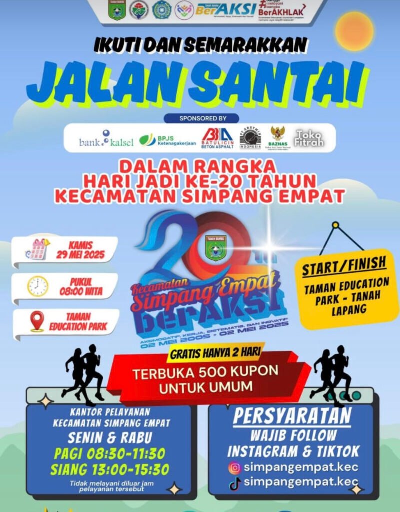 FokusInformasi.com, Tanah Bumbu – Dalam rangka memperingati hari jadi ke-20 Kecamatan Simpang Empat, akan digelar acara jalan santai yang berlangsung pada Kamis, 29 Mei 2025 pukul 08.00 WITA di Taman Education Park, Tanah Lapang. Acara ini terbuka untuk umum dengan kuota terbatas sebanyak 500 kupon yang tersedia gratis selama dua hari.